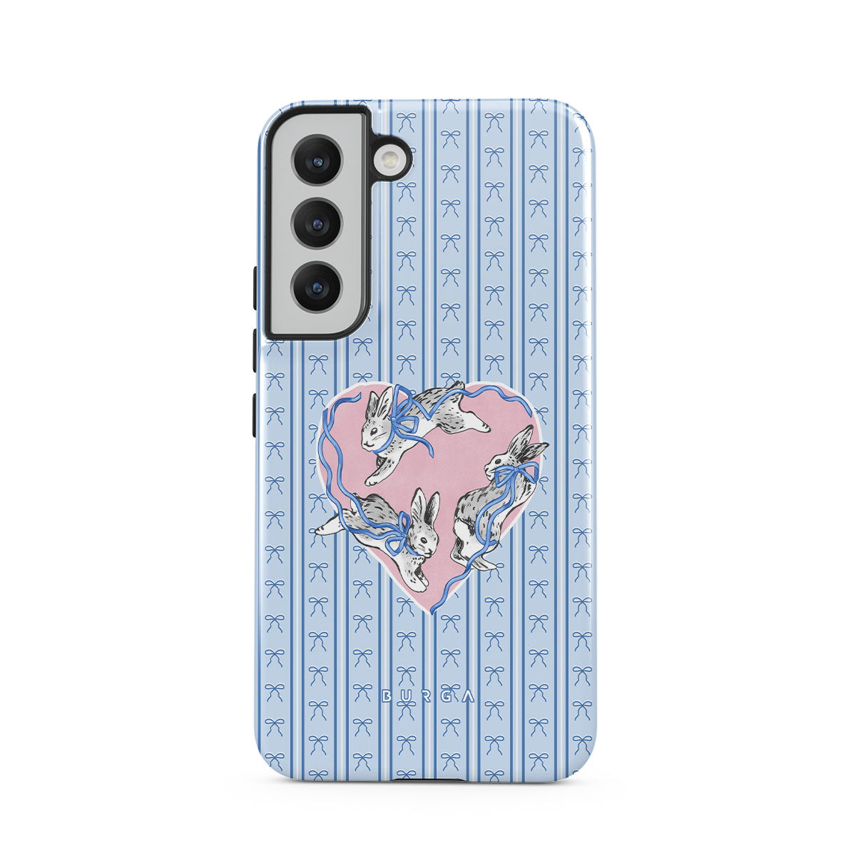 Este design contém: coelhos brancos, moldura de coração, riscas azuis