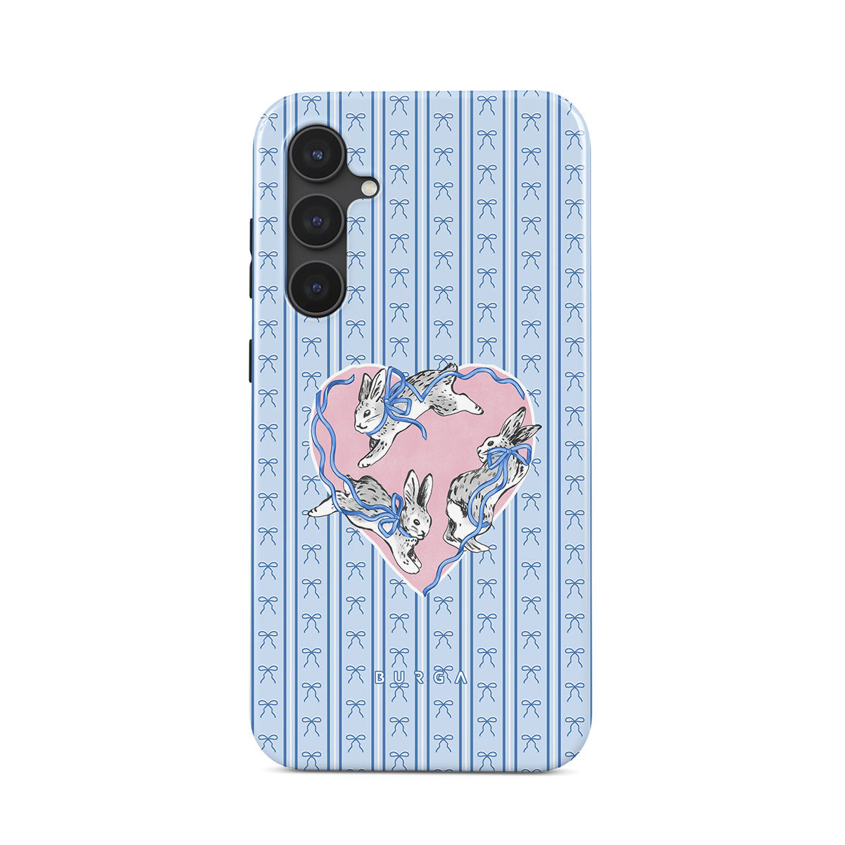 Este design contém: coelhos brancos, moldura de coração, riscas azuis