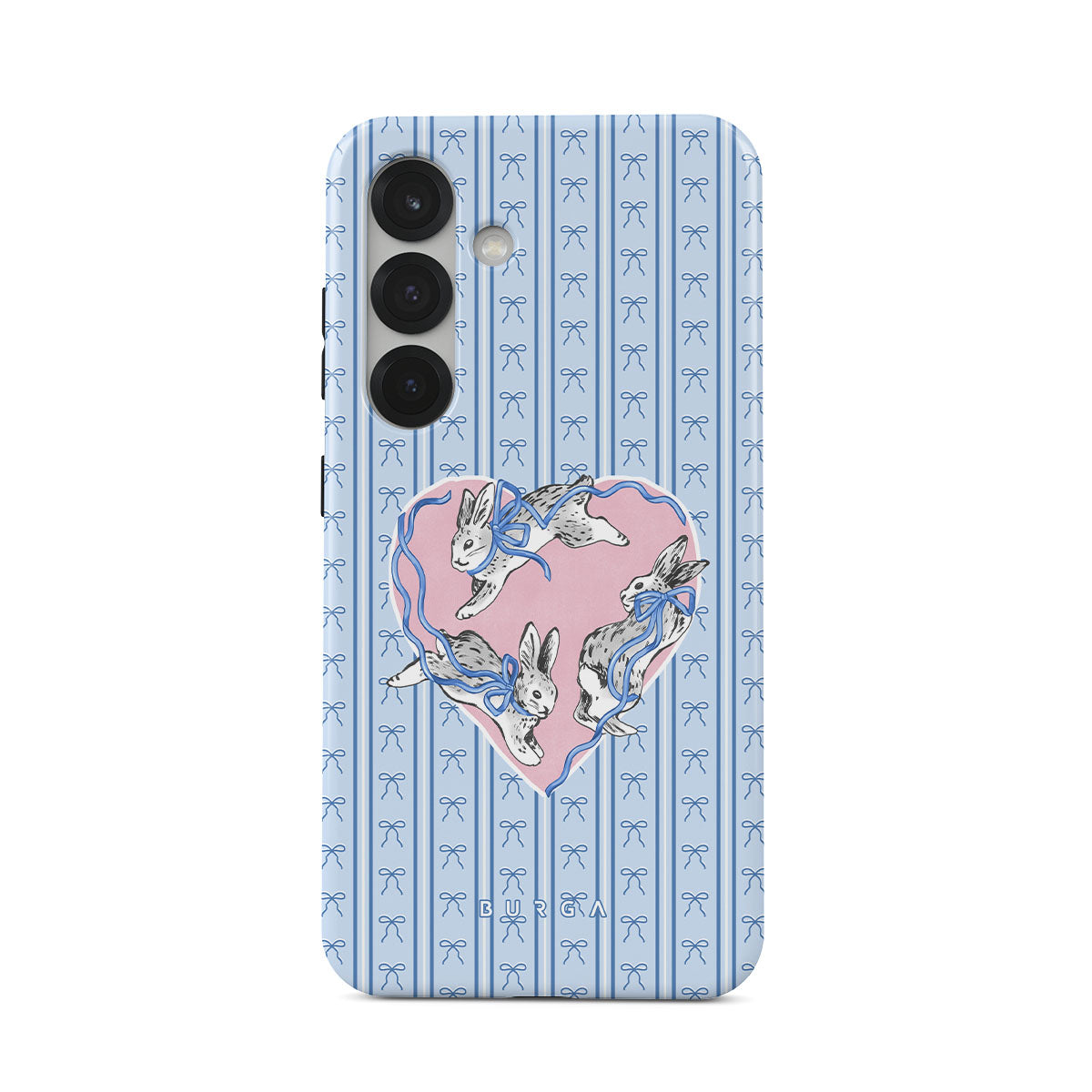 Este design contém: coelhos brancos, moldura de coração, riscas azuis