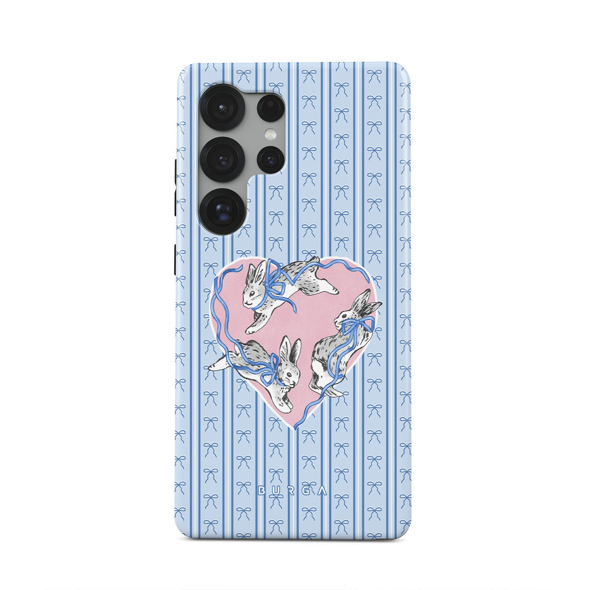 Este design contém: coelhos brancos, moldura de coração, riscas azuis