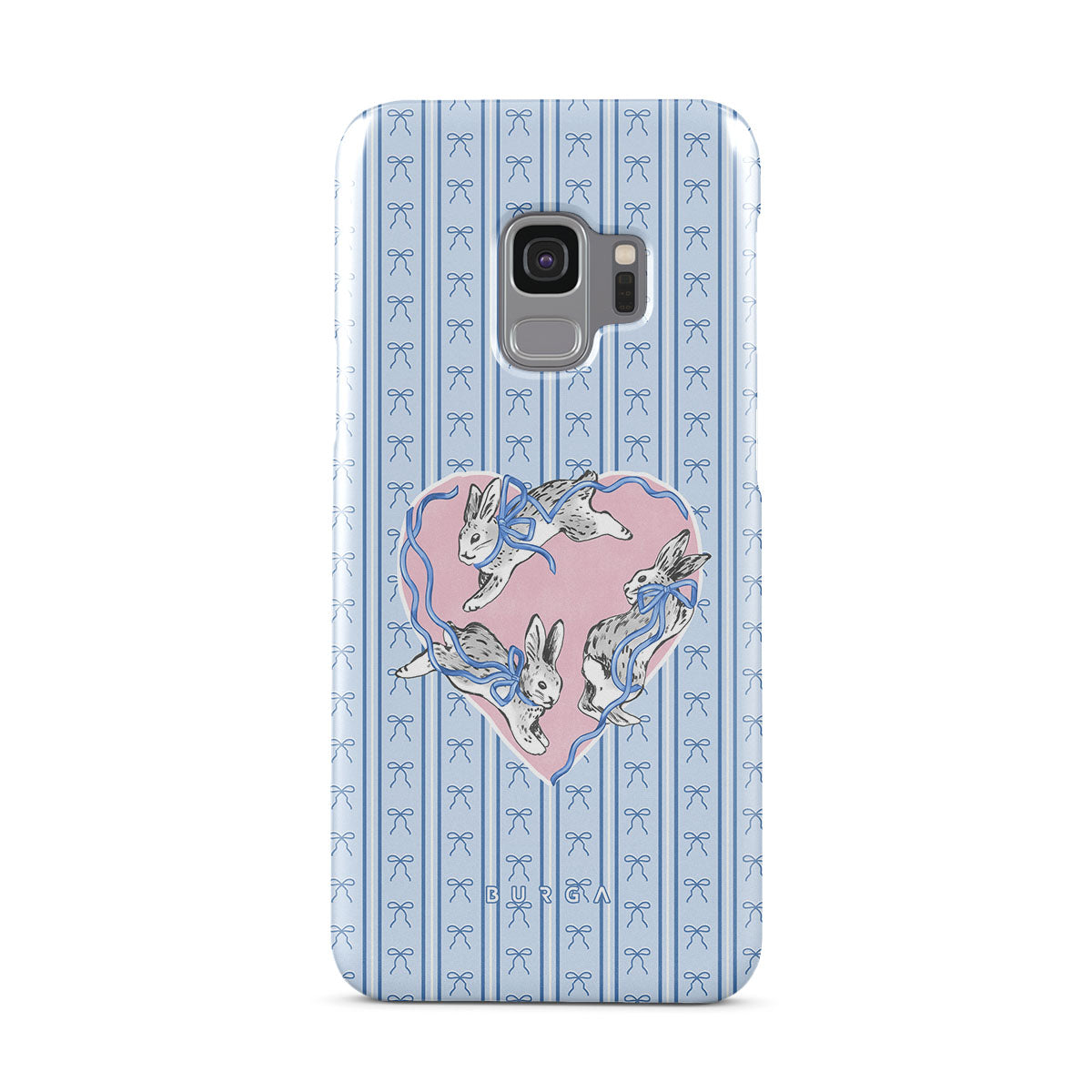 Este design contém: coelhos brancos, moldura de coração, riscas azuis