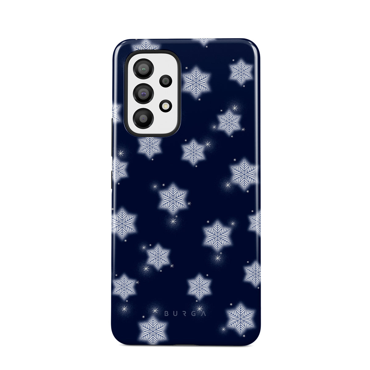 Este design contém: flocos de neve brancos, fundo azul marinho, padrão de flocos de neve de inverno, flocos de neve geométricos, design de inverno clássico