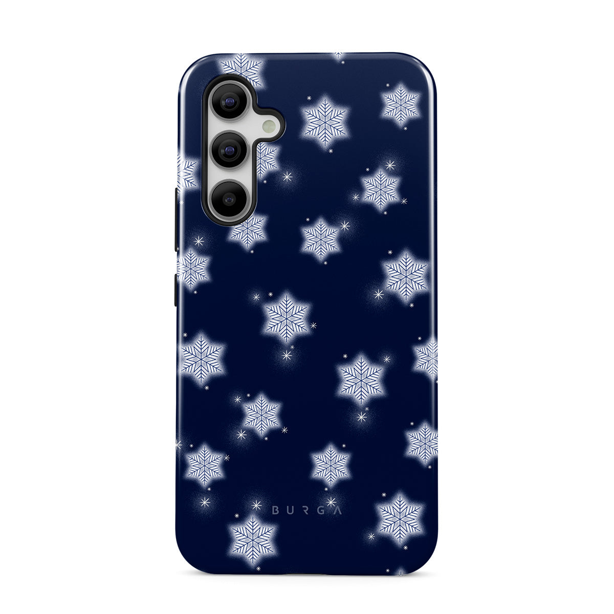 Este design contém: flocos de neve brancos, fundo azul marinho, padrão de flocos de neve de inverno, flocos de neve geométricos, design de inverno clássico
