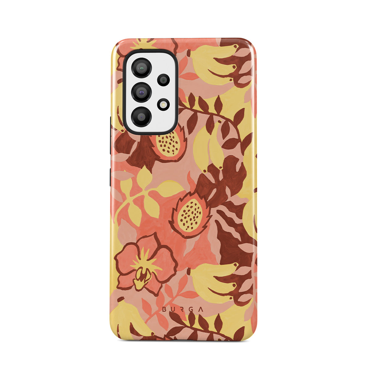 Este design contém: bananas, goiabas, mangas, padrão de frutas tropicais, flores