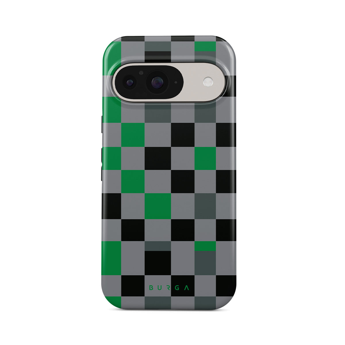 Este design contém: padrão xadrez, verde, cinzento e preto, geométrico