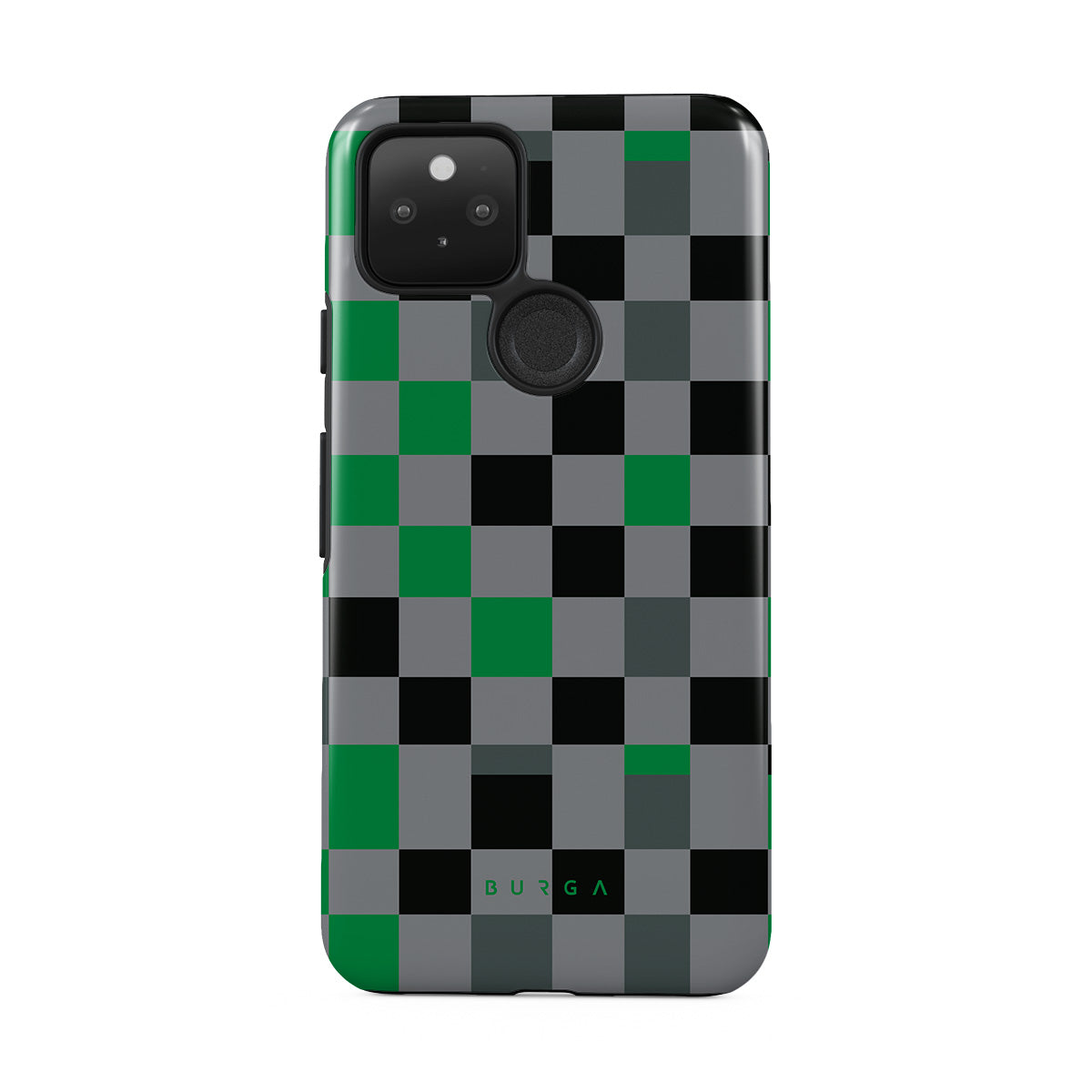 Este design contém: padrão xadrez, verde, cinzento e preto, geométrico