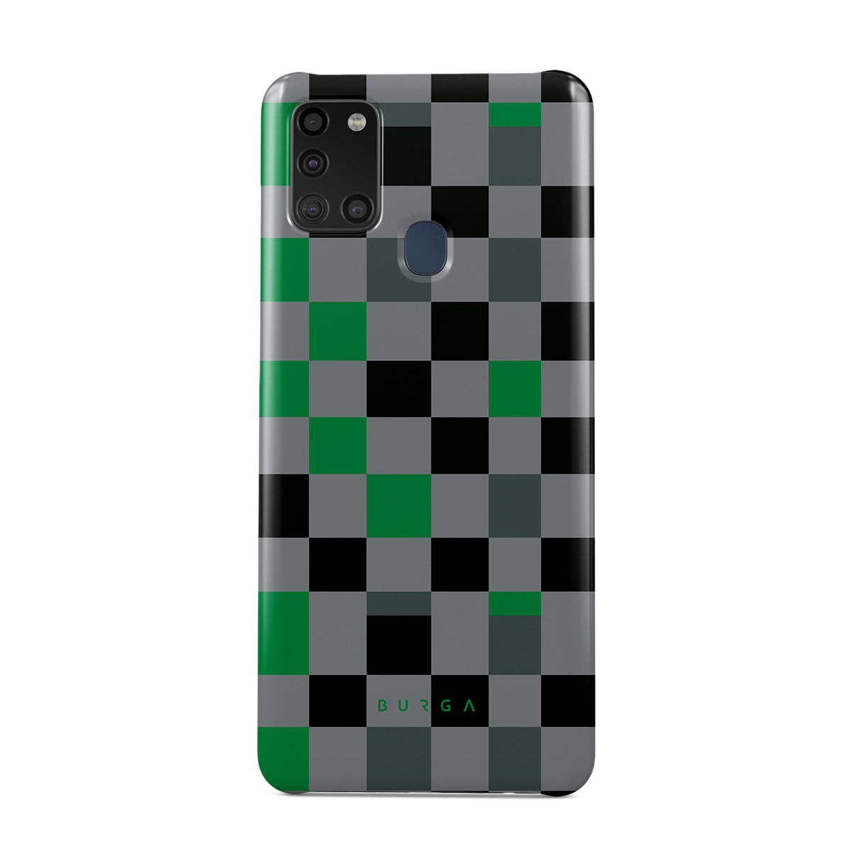 Este design contém: padrão xadrez, verde, cinzento e preto, geométrico