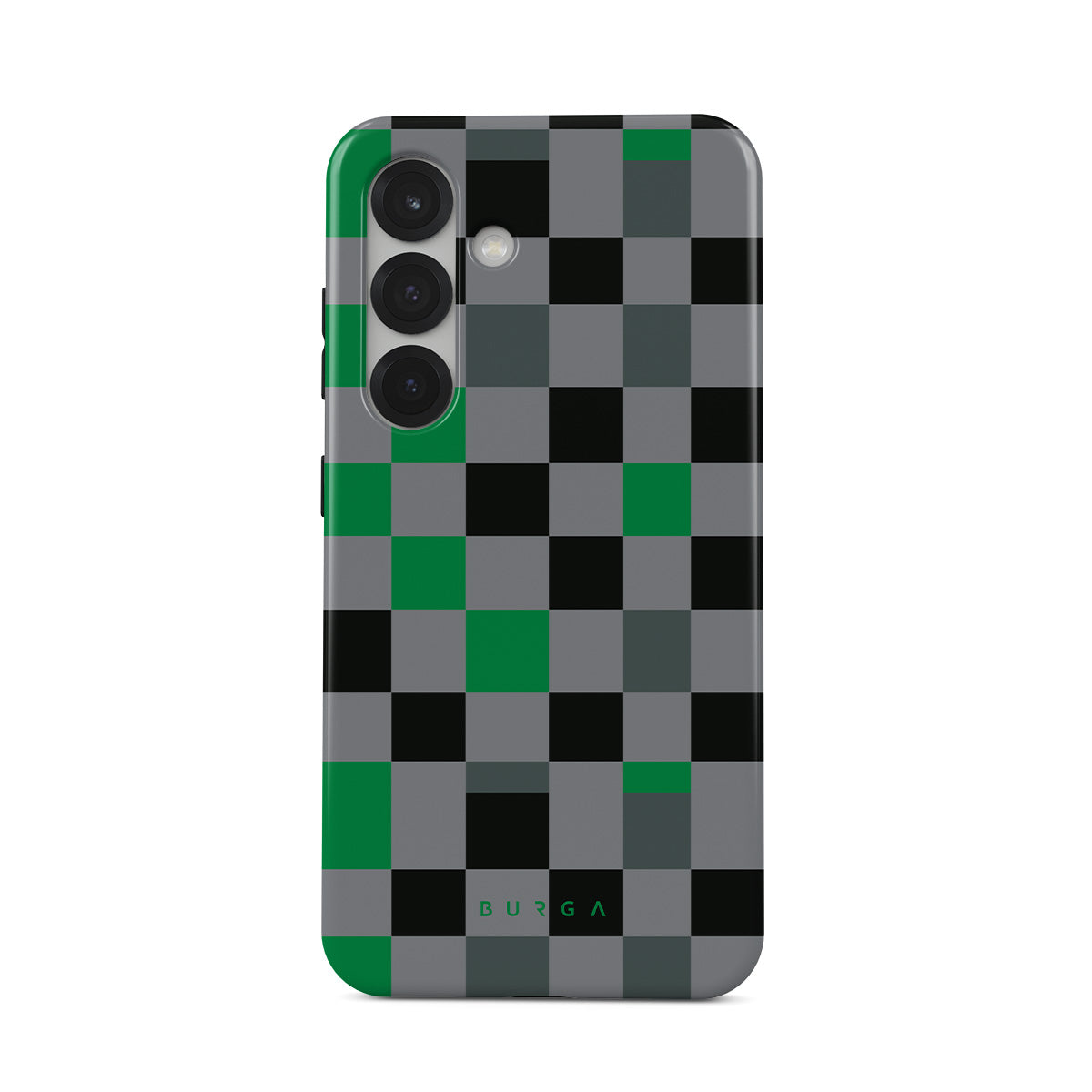 Este design contém: padrão xadrez, verde, cinzento e preto, geométrico