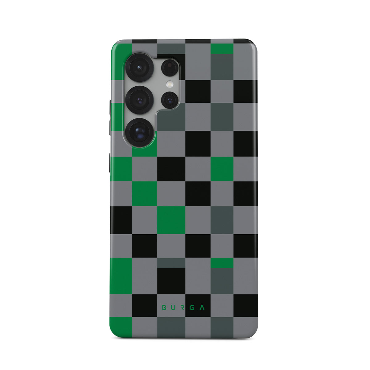 Este design contém: padrão xadrez, verde, cinzento e preto, geométrico