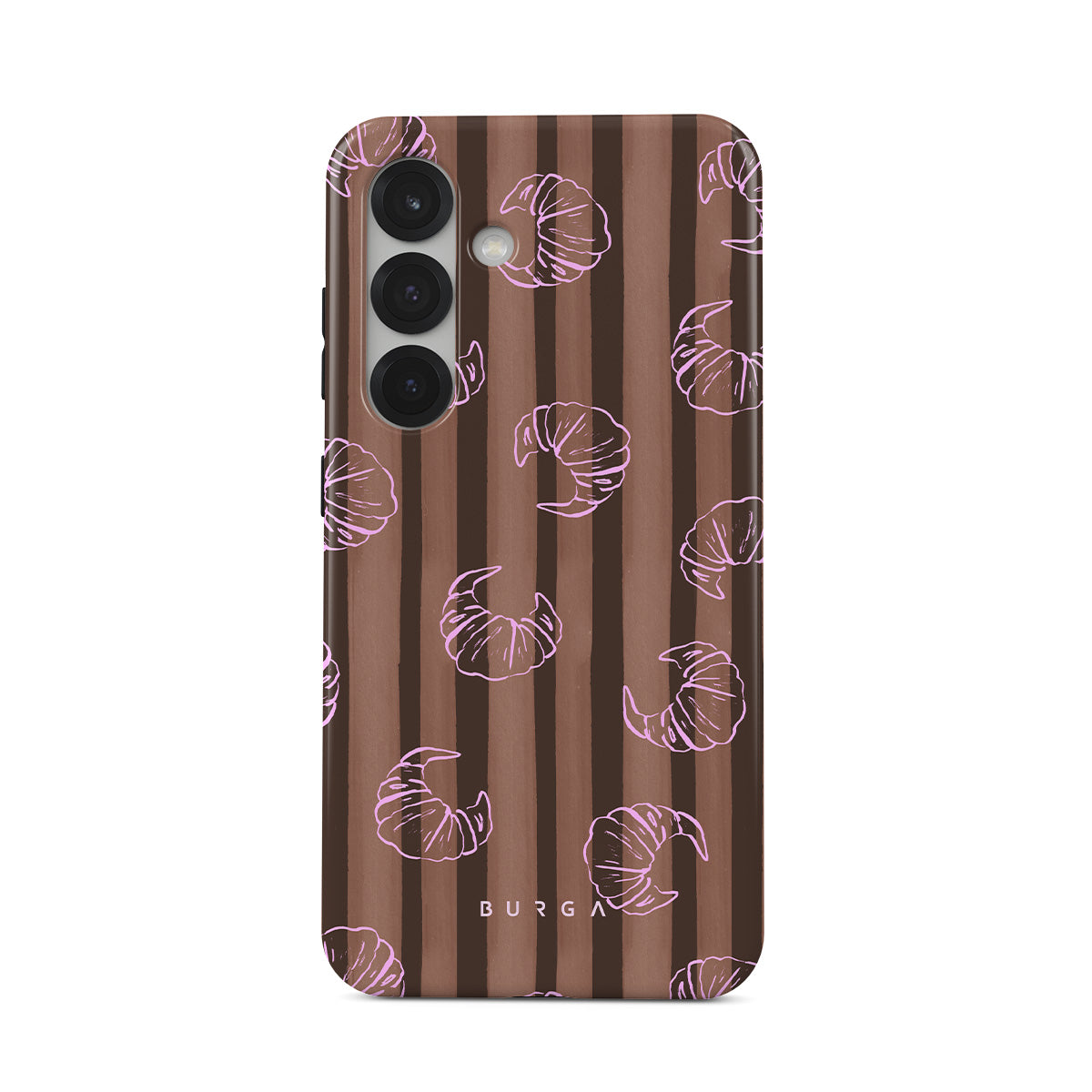 Este design contém: riscas verticais, riscas castanhas e bege, croissants