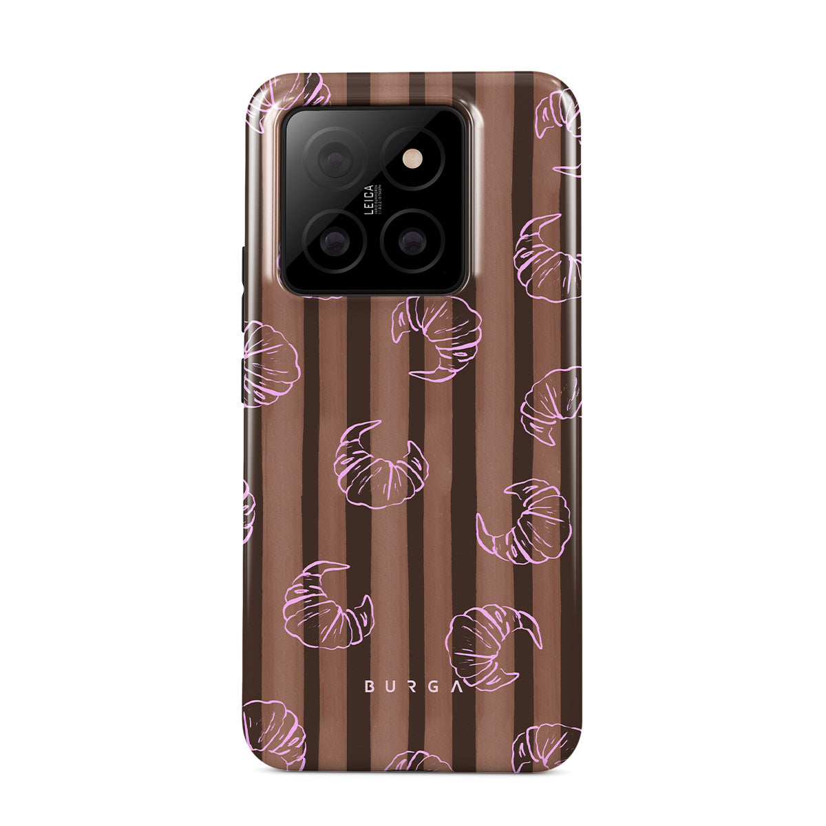 Este design contém: riscas verticais, riscas castanhas e bege, croissants