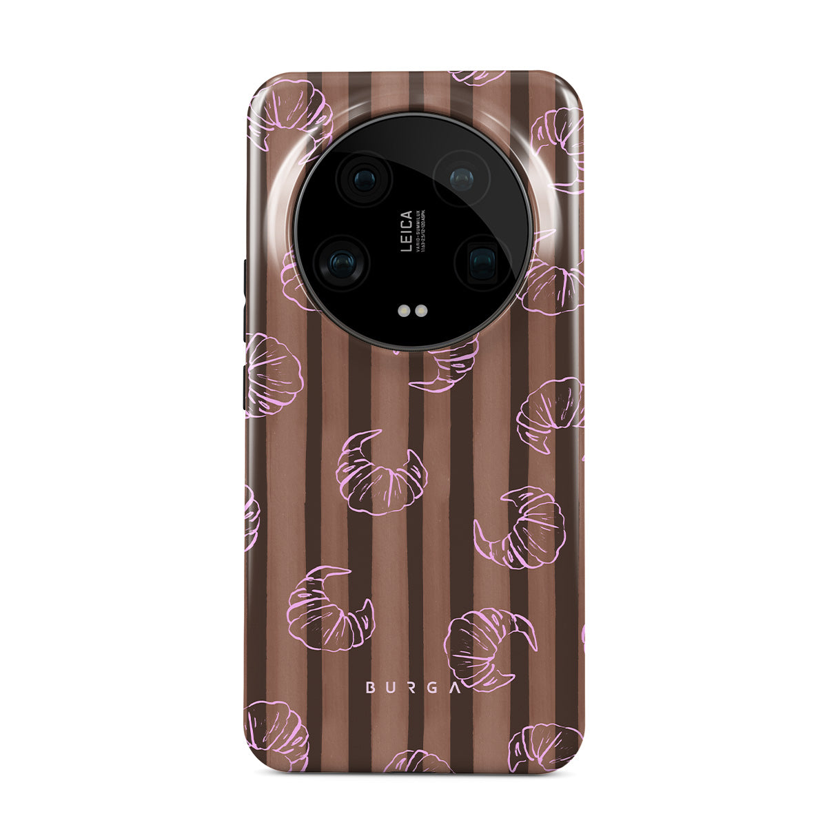 Este design contém: riscas verticais, riscas castanhas e bege, croissants