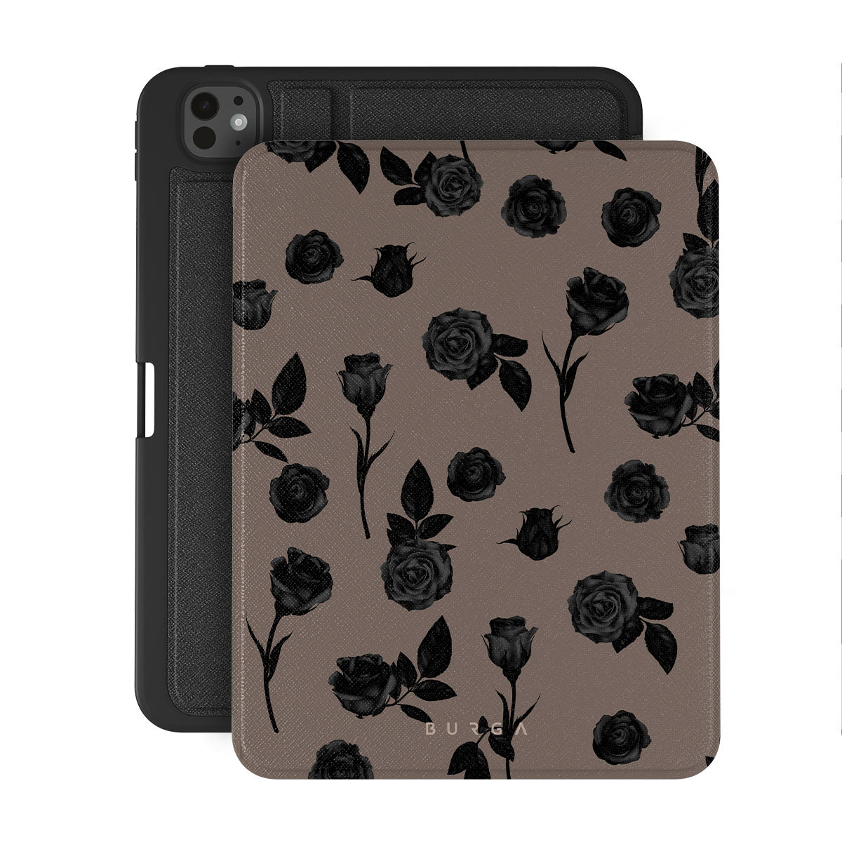 Este design contém: rosas pretas, tons terra, pormenores florais, flores escuras.