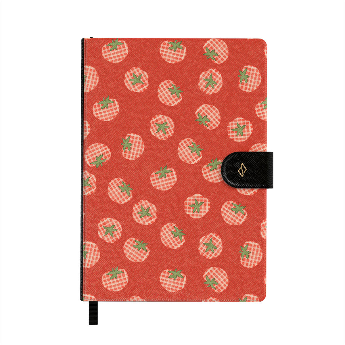 Apresenta padrões BURGA bem detalhados numa capa em pele sintética vegana, com um elegante marcador de páginas em fita preta.