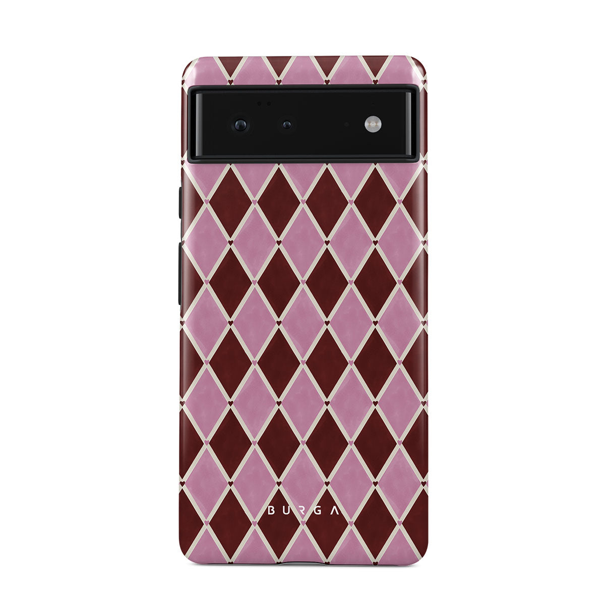 Este design contém: padrão arlequim, losangos rosa, fundo vermelho intenso
