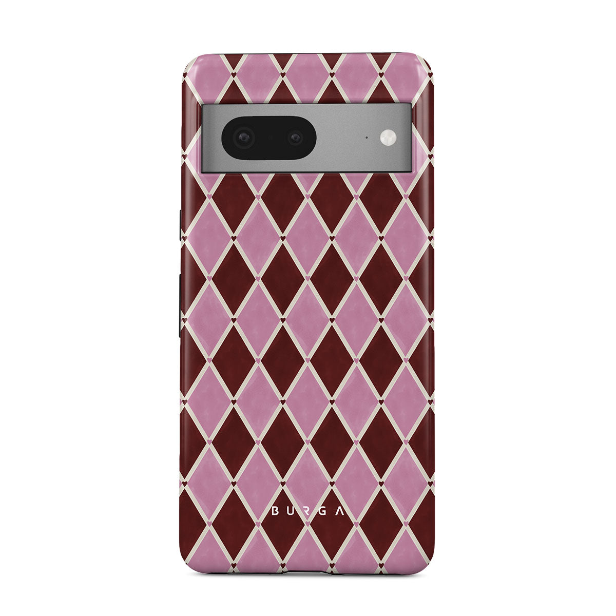 Este design contém: padrão arlequim, losangos rosa, fundo vermelho intenso