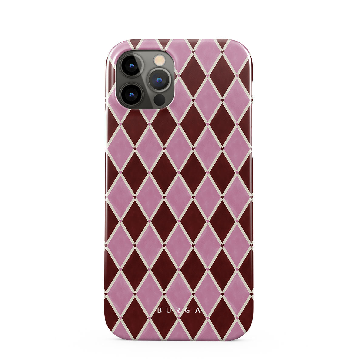 Este design contém: padrão arlequim, losangos rosa, fundo vermelho intenso