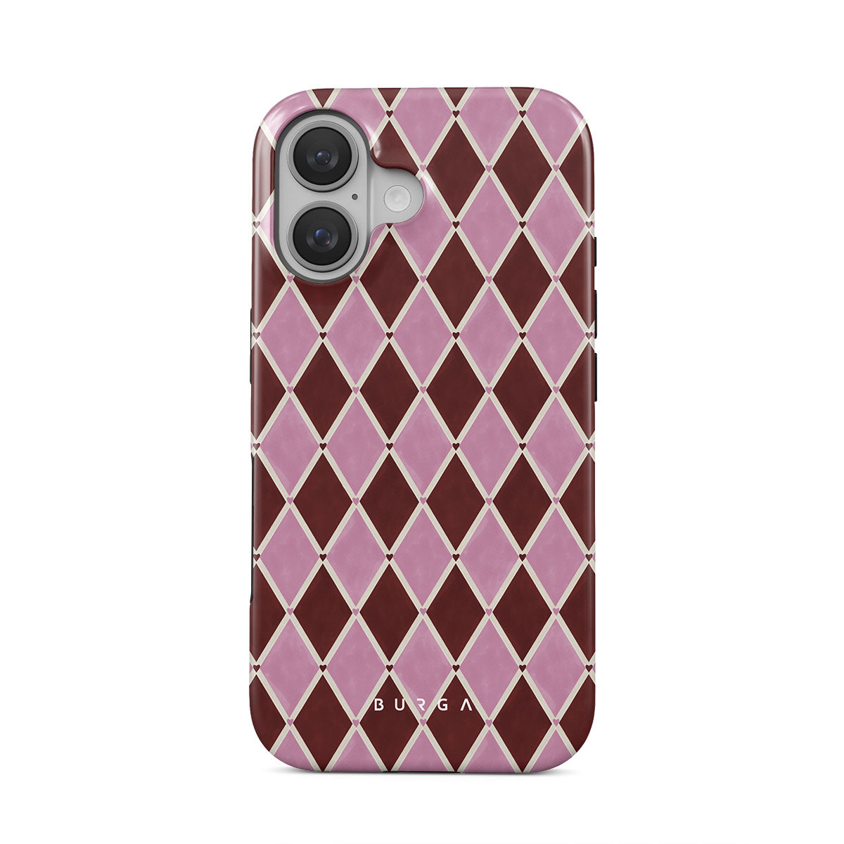 Este design contém: padrão arlequim, losangos rosa, fundo vermelho intenso