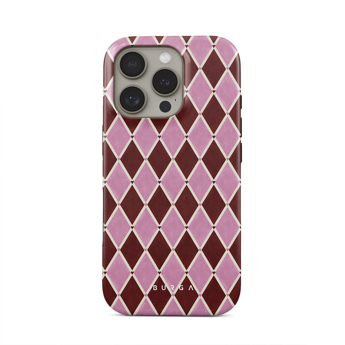 Este design contém: padrão arlequim, losangos rosa, fundo vermelho intenso