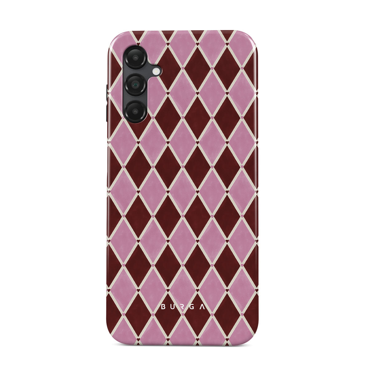 Este design contém: padrão arlequim, losangos rosa, fundo vermelho intenso