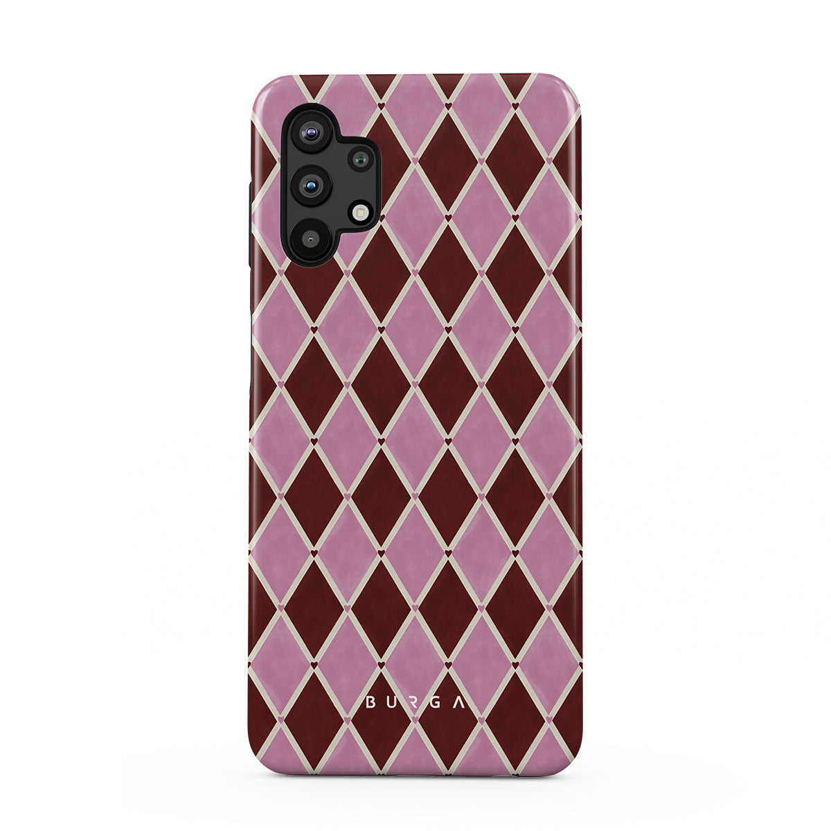 Este design contém: padrão arlequim, losangos rosa, fundo vermelho intenso