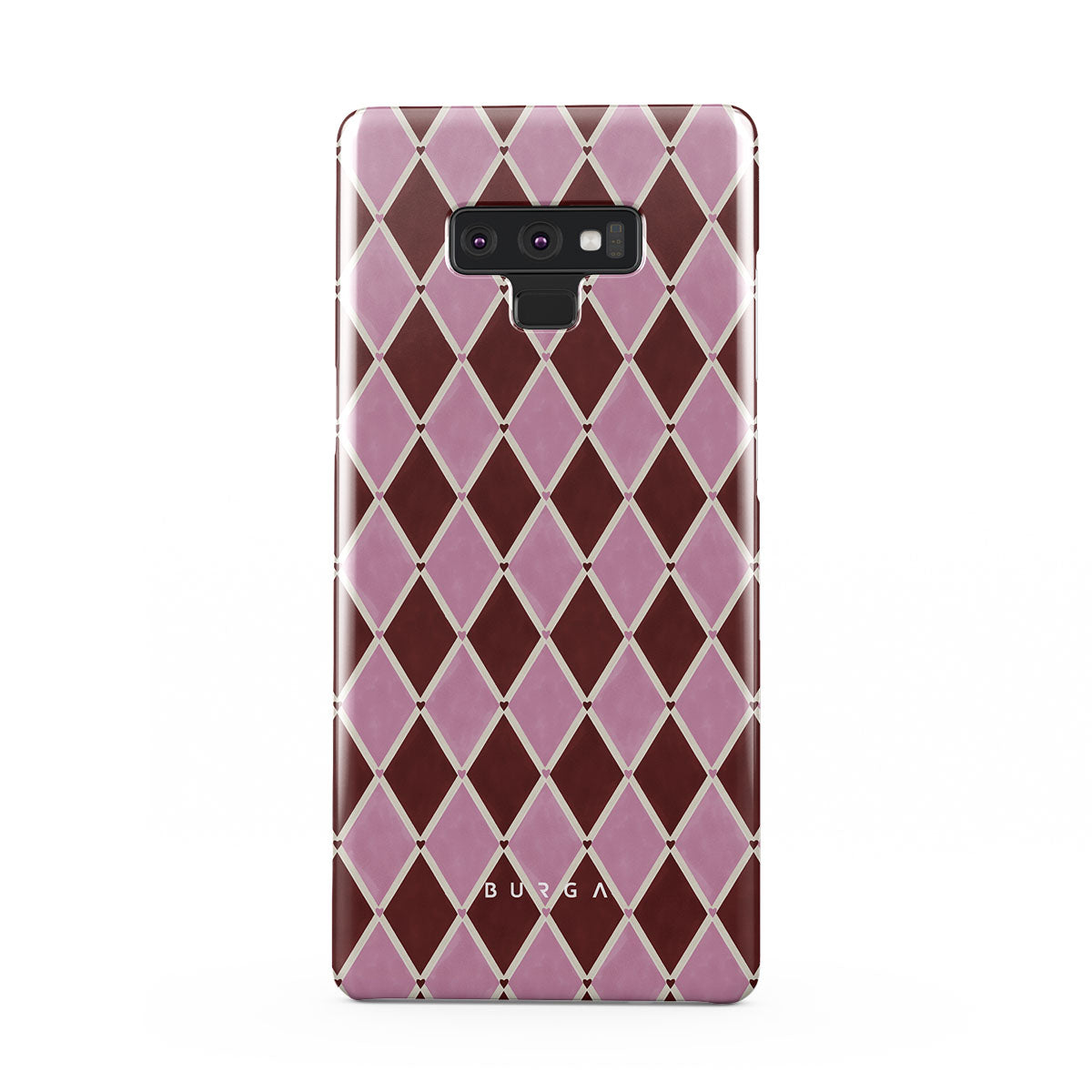 Este design contém: padrão arlequim, losangos rosa, fundo vermelho intenso