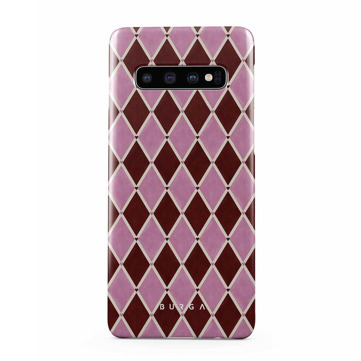 Este design contém: padrão arlequim, losangos rosa, fundo vermelho intenso