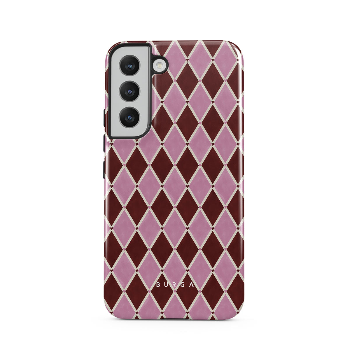 Este design contém: padrão arlequim, losangos rosa, fundo vermelho intenso