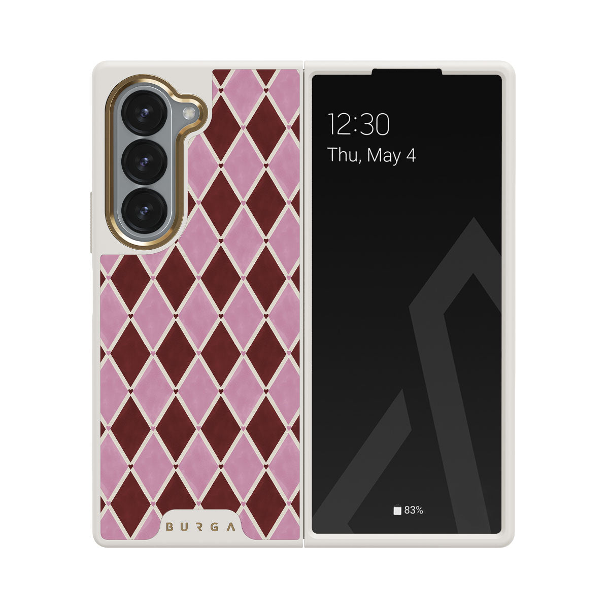 Este design contém: padrão arlequim, losangos rosa, fundo vermelho intenso