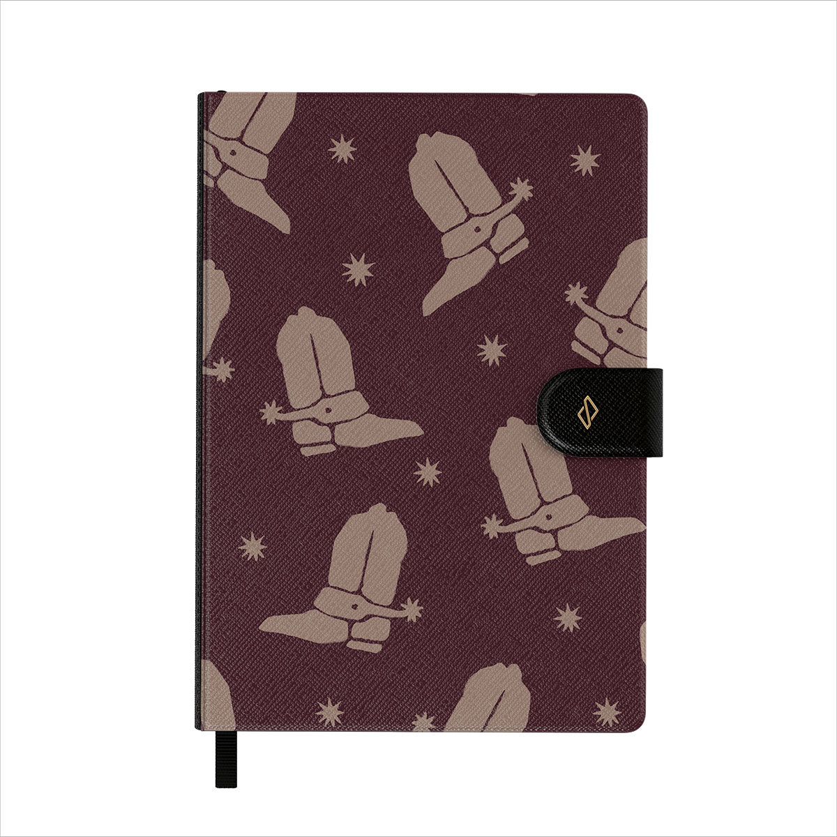 Apresenta padrões BURGA bem detalhados numa capa em pele sintética vegana, com um elegante marcador de páginas em fita preta.