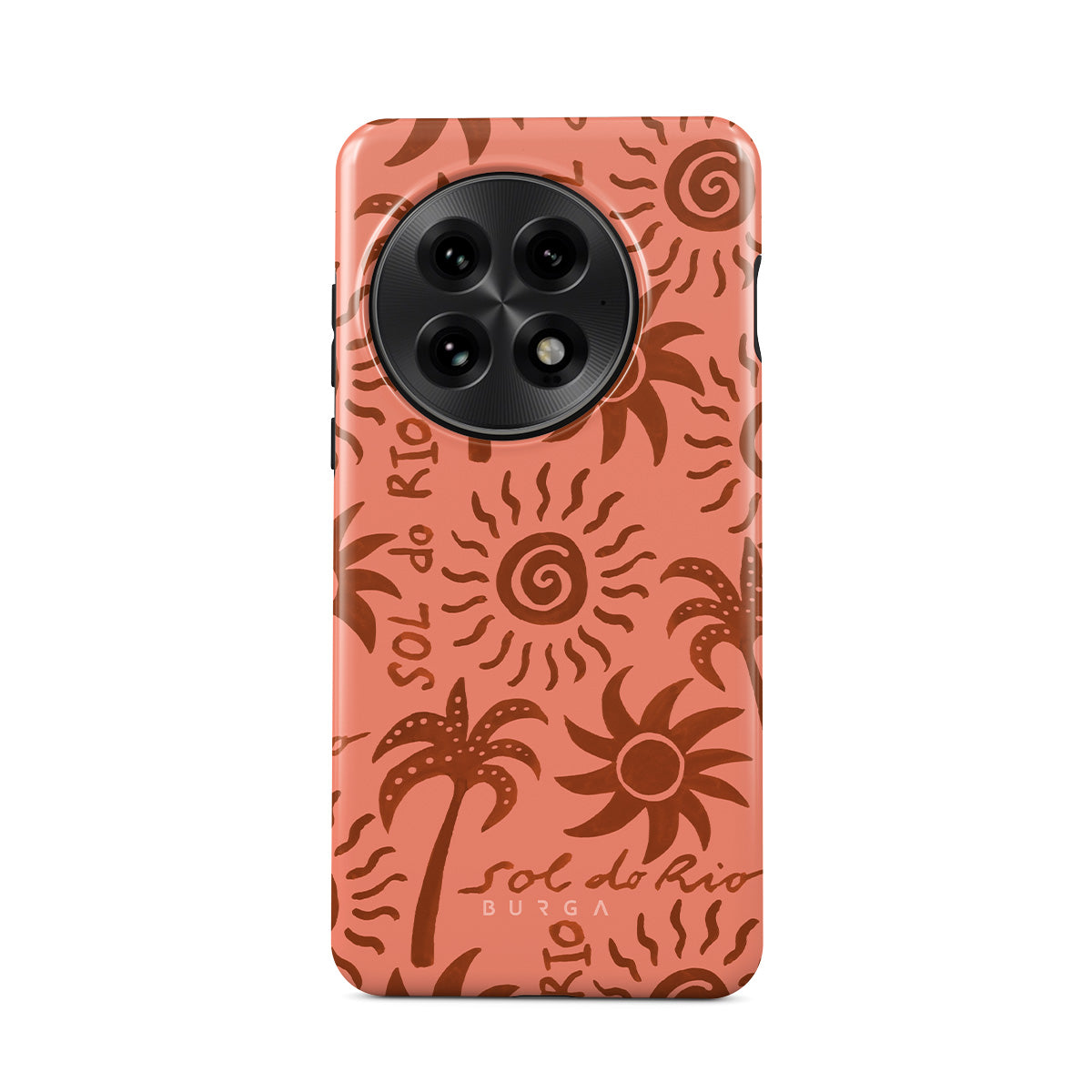 Este design contém: desenhos de sol, coqueiros, formas abstratas, tons terrosos quentes