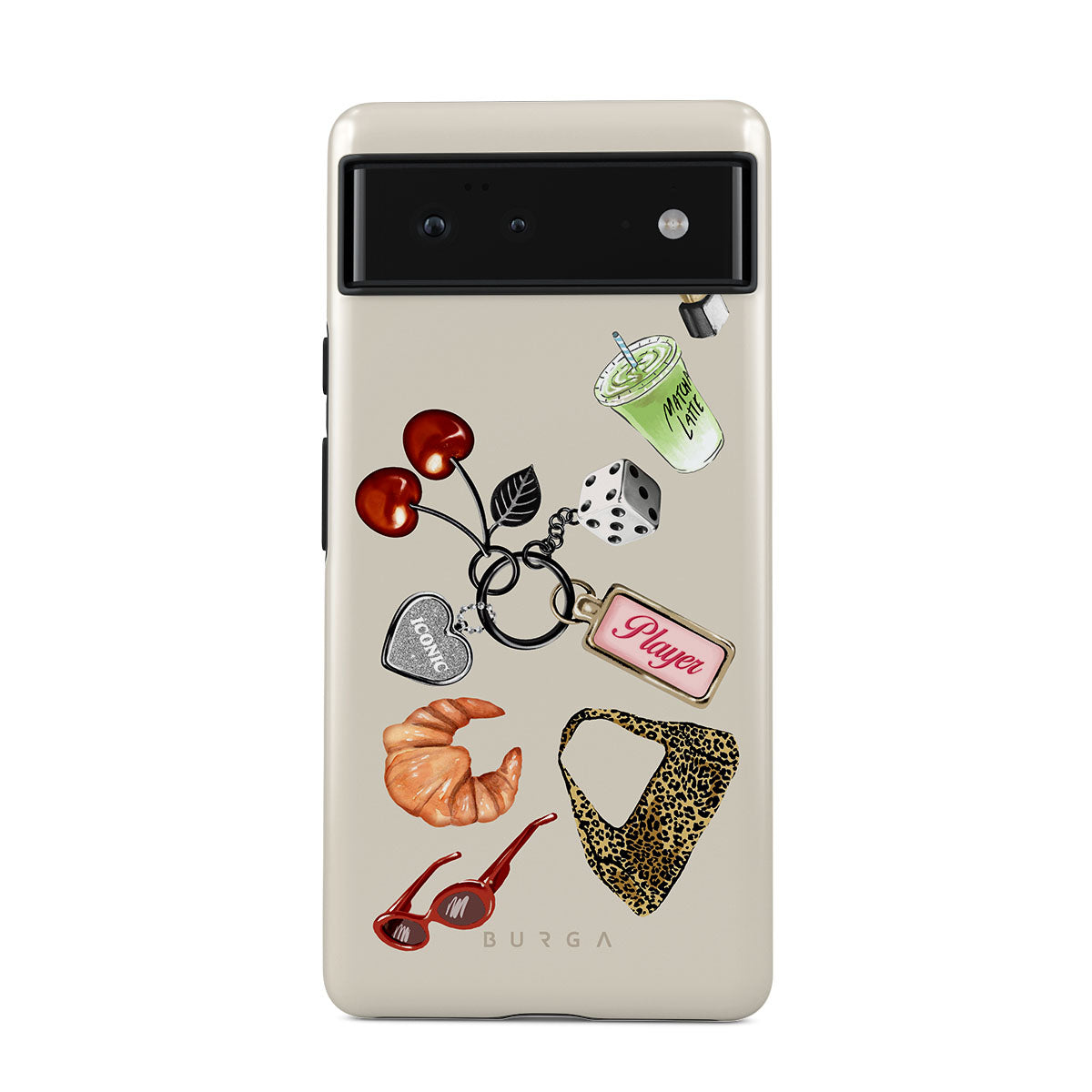 Este design contém: óculos de sol vermelhos, batom vermelho, bebida de matcha verde, croissant, dados pretos, mala com padrão leopardo, porta-chaves com coração prateado, cerejas, dados e etiqueta "Jogadora".