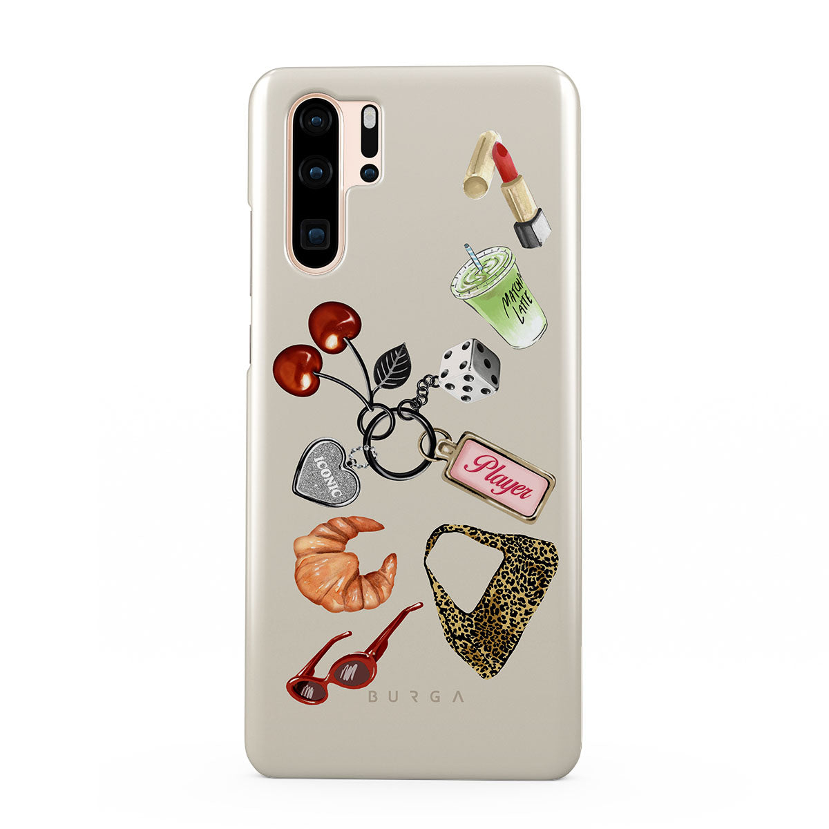 Este design contém: óculos de sol vermelhos, batom vermelho, bebida de matcha verde, croissant, dados pretos, mala com padrão leopardo, porta-chaves com coração prateado, cerejas, dados e etiqueta "Jogadora".