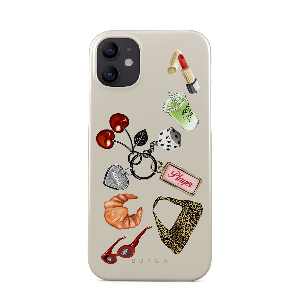 Este design contém: óculos de sol vermelhos, batom vermelho, bebida de matcha verde, croissant, dados pretos, mala com padrão leopardo, porta-chaves com coração prateado, cerejas, dados e etiqueta "Jogadora".