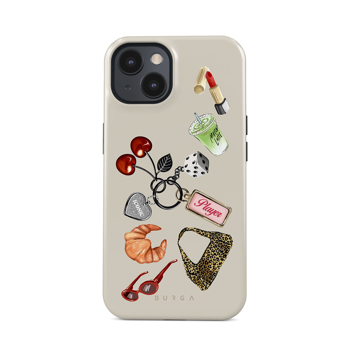 Este design contém: óculos de sol vermelhos, batom vermelho, bebida de matcha verde, croissant, dados pretos, mala com padrão leopardo, porta-chaves com coração prateado, cerejas, dados e etiqueta "Jogadora".