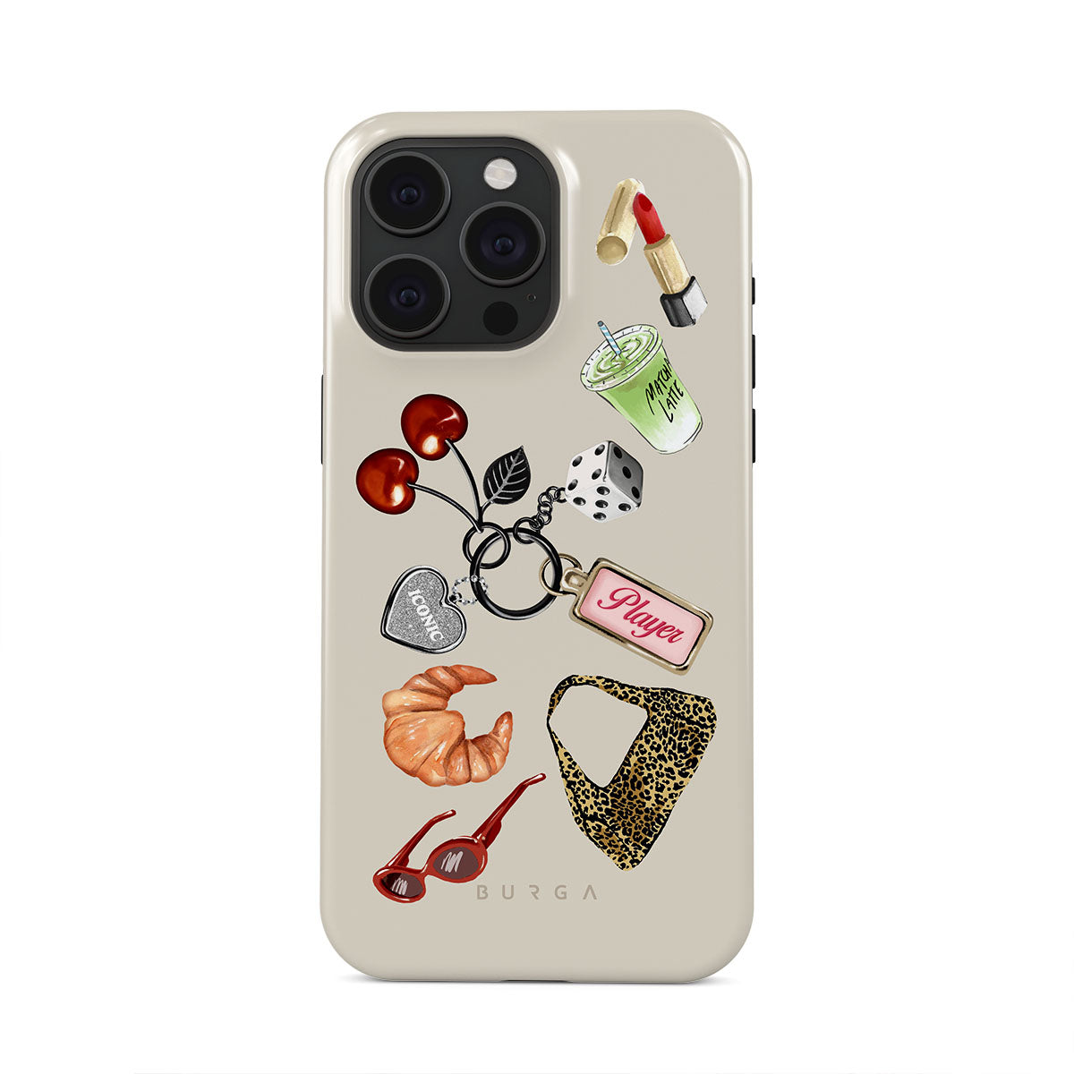 Este design contém: óculos de sol vermelhos, batom vermelho, bebida de matcha verde, croissant, dados pretos, mala com padrão leopardo, porta-chaves com coração prateado, cerejas, dados e etiqueta "Jogadora".
