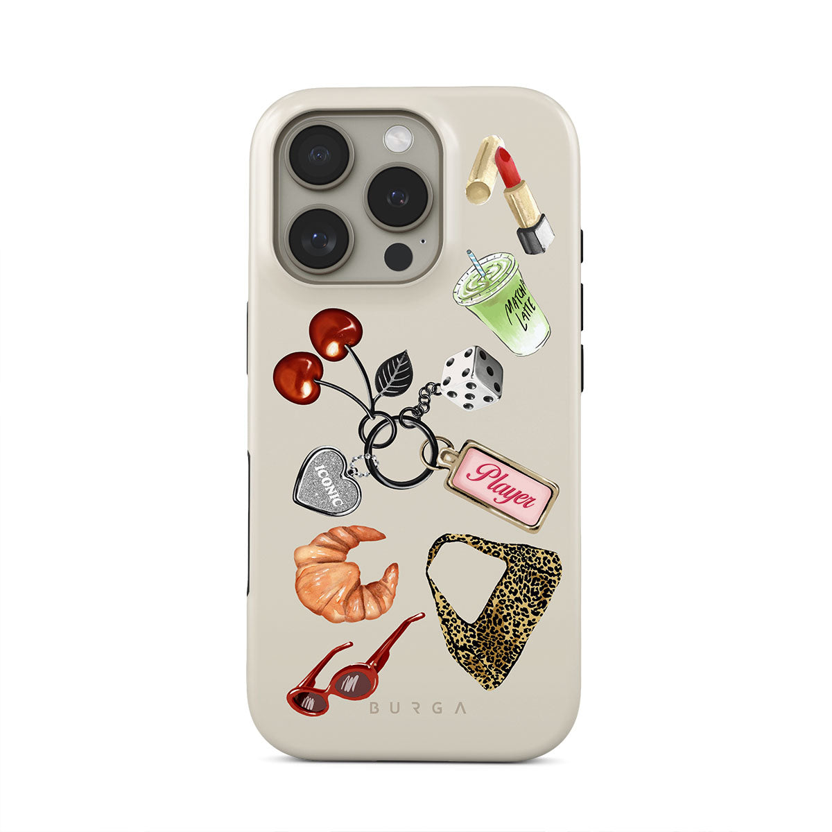 Este design contém: óculos de sol vermelhos, batom vermelho, bebida de matcha verde, croissant, dados pretos, mala com padrão leopardo, porta-chaves com coração prateado, cerejas, dados e etiqueta "Jogadora".