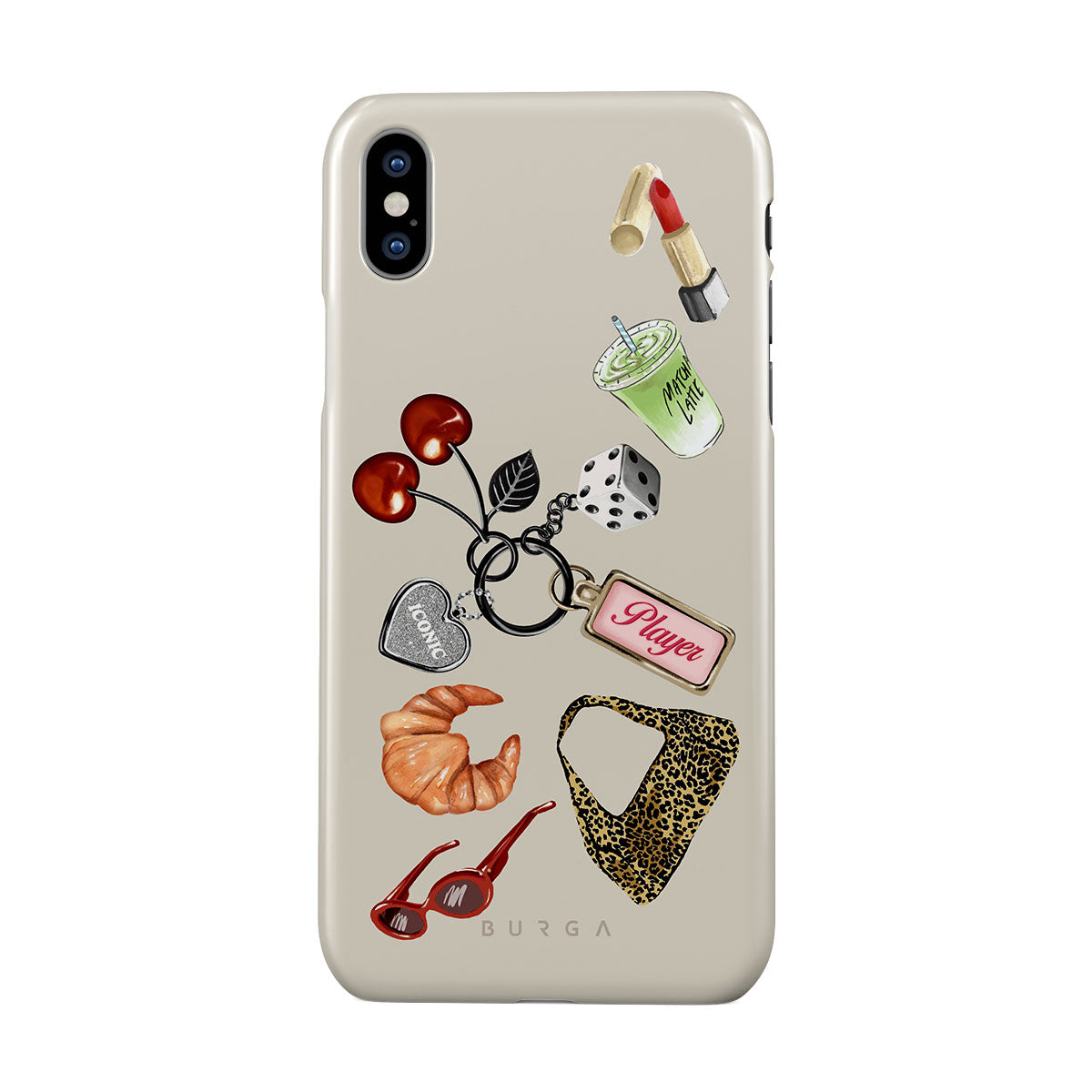 Este design contém: óculos de sol vermelhos, batom vermelho, bebida de matcha verde, croissant, dados pretos, mala com padrão leopardo, porta-chaves com coração prateado, cerejas, dados e etiqueta "Jogadora".