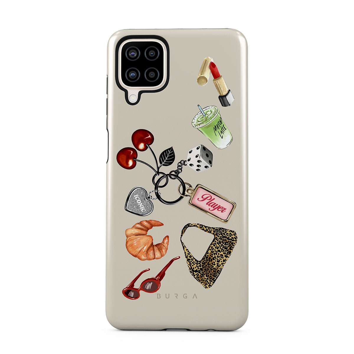 Este design contém: óculos de sol vermelhos, batom vermelho, bebida de matcha verde, croissant, dados pretos, mala com padrão leopardo, porta-chaves com coração prateado, cerejas, dados e etiqueta "Jogadora".