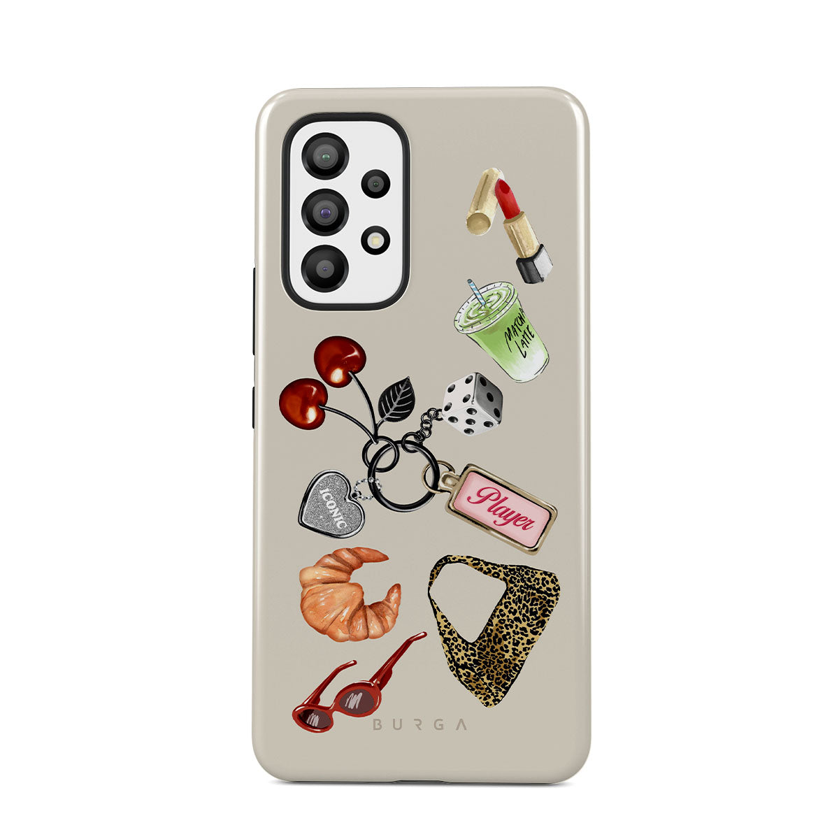 Este design contém: óculos de sol vermelhos, batom vermelho, bebida de matcha verde, croissant, dados pretos, mala com padrão leopardo, porta-chaves com coração prateado, cerejas, dados e etiqueta "Jogadora".