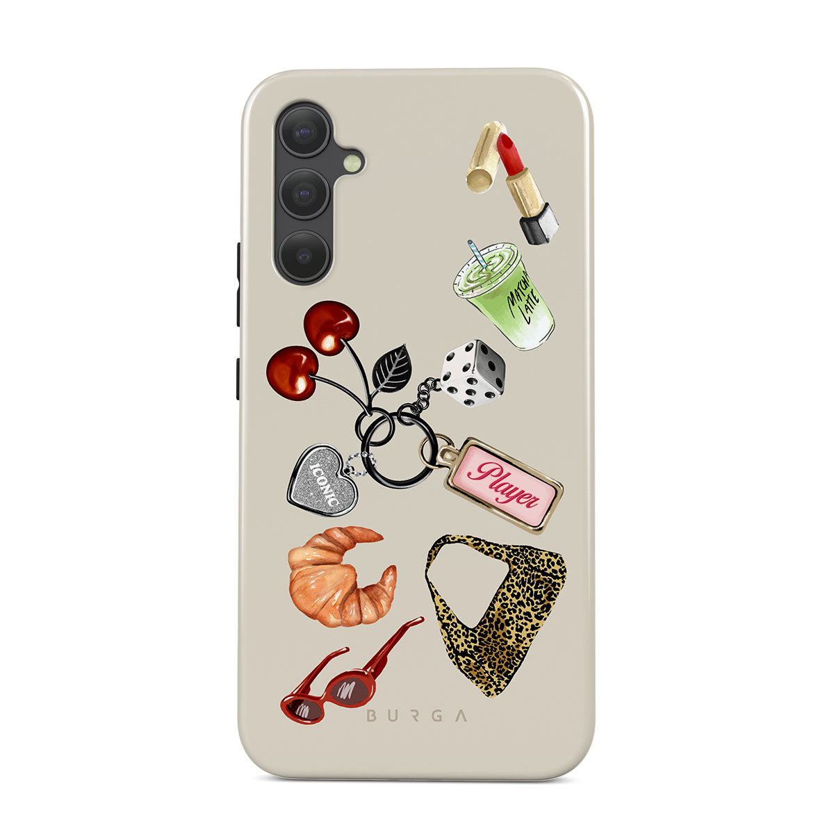 Este design contém: óculos de sol vermelhos, batom vermelho, bebida de matcha verde, croissant, dados pretos, mala com padrão leopardo, porta-chaves com coração prateado, cerejas, dados e etiqueta "Jogadora".