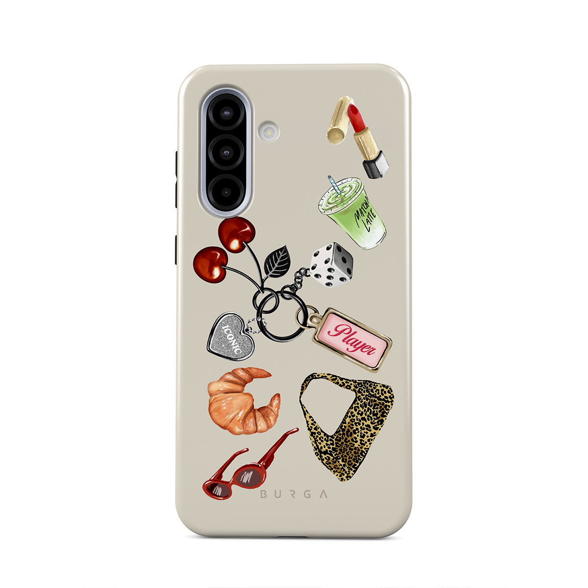 Este design contém: óculos de sol vermelhos, batom vermelho, bebida de matcha verde, croissant, dados pretos, mala com padrão leopardo, porta-chaves com coração prateado, cerejas, dados e etiqueta "Jogadora".