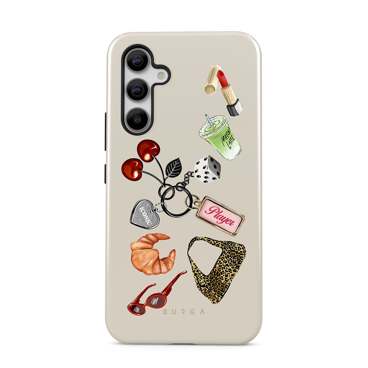 Este design contém: óculos de sol vermelhos, batom vermelho, bebida de matcha verde, croissant, dados pretos, mala com padrão leopardo, porta-chaves com coração prateado, cerejas, dados e etiqueta "Jogadora".