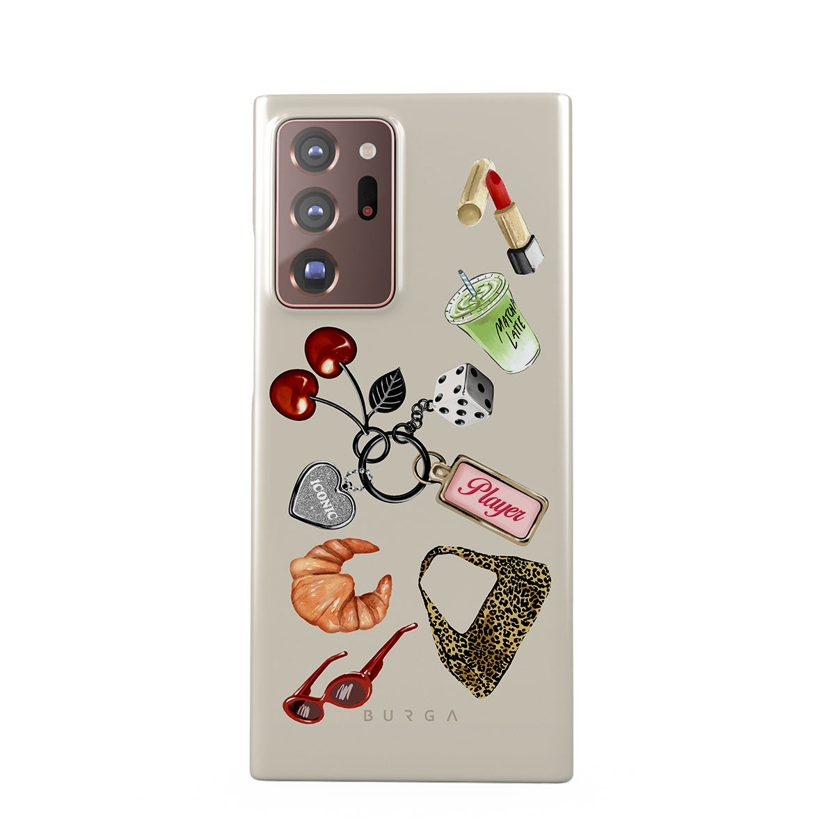 Este design contém: óculos de sol vermelhos, batom vermelho, bebida de matcha verde, croissant, dados pretos, mala com padrão leopardo, porta-chaves com coração prateado, cerejas, dados e etiqueta "Jogadora".