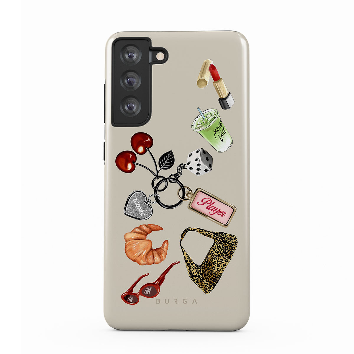 Este design contém: óculos de sol vermelhos, batom vermelho, bebida de matcha verde, croissant, dados pretos, mala com padrão leopardo, porta-chaves com coração prateado, cerejas, dados e etiqueta "Jogadora".