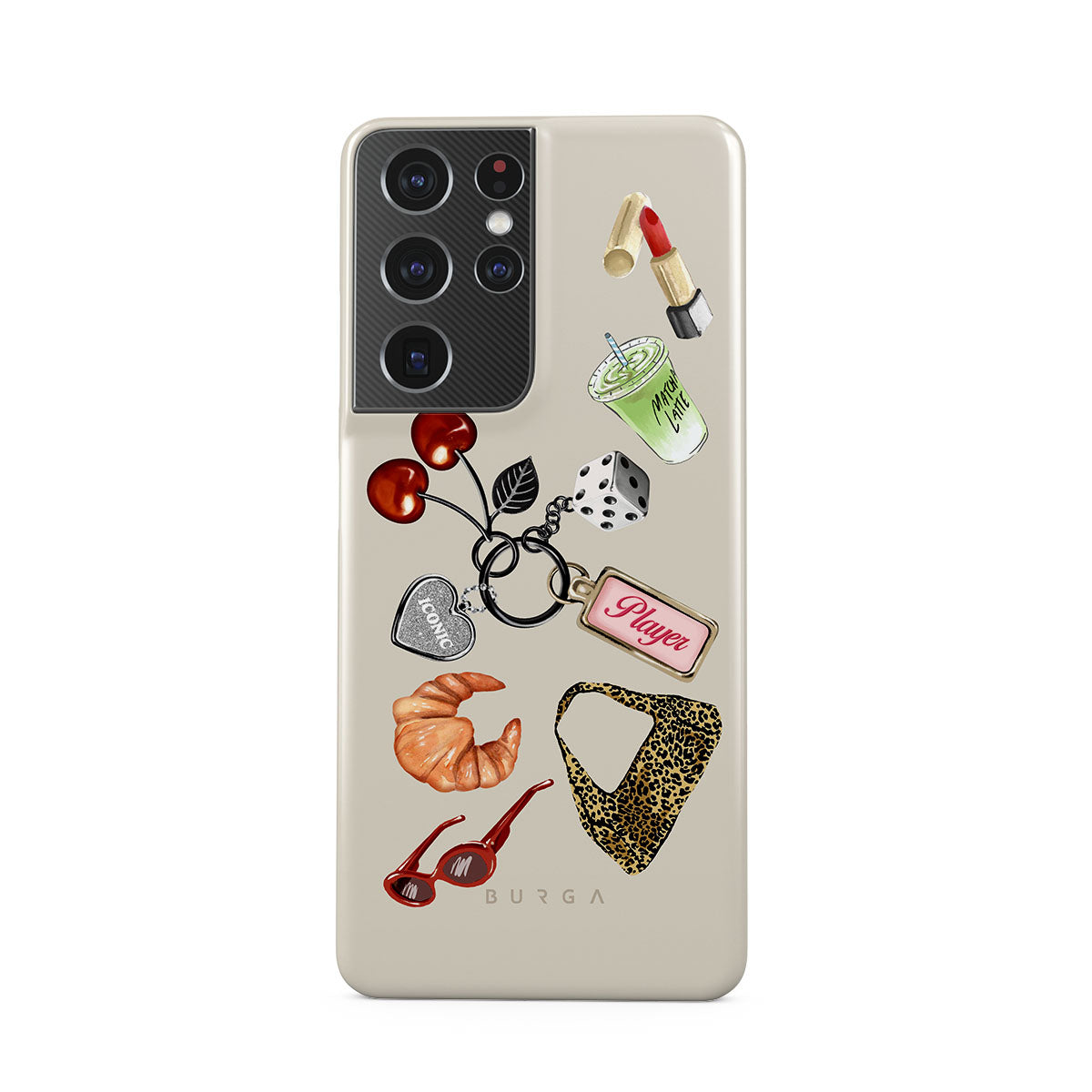 Este design contém: óculos de sol vermelhos, batom vermelho, bebida de matcha verde, croissant, dados pretos, mala com padrão leopardo, porta-chaves com coração prateado, cerejas, dados e etiqueta "Jogadora".