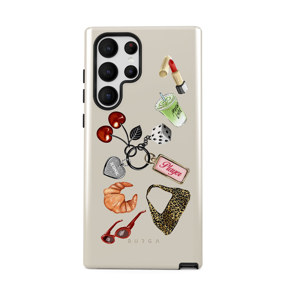 Este design contém: óculos de sol vermelhos, batom vermelho, bebida de matcha verde, croissant, dados pretos, mala com padrão leopardo, porta-chaves com coração prateado, cerejas, dados e etiqueta "Jogadora".
