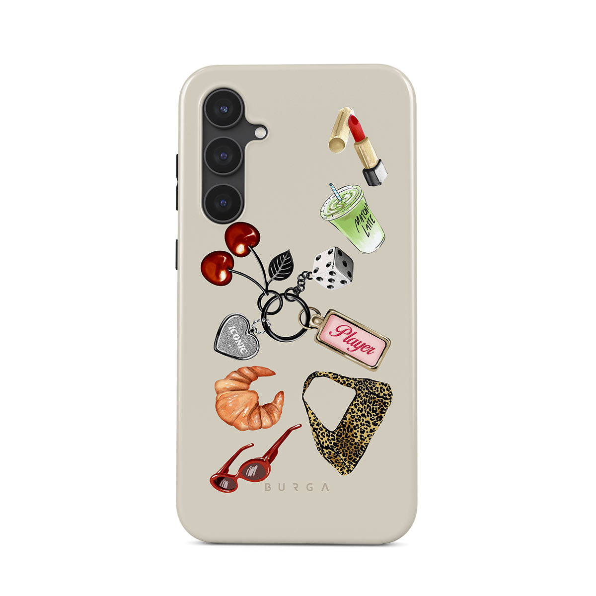 Este design contém: óculos de sol vermelhos, batom vermelho, bebida de matcha verde, croissant, dados pretos, mala com padrão leopardo, porta-chaves com coração prateado, cerejas, dados e etiqueta "Jogadora".