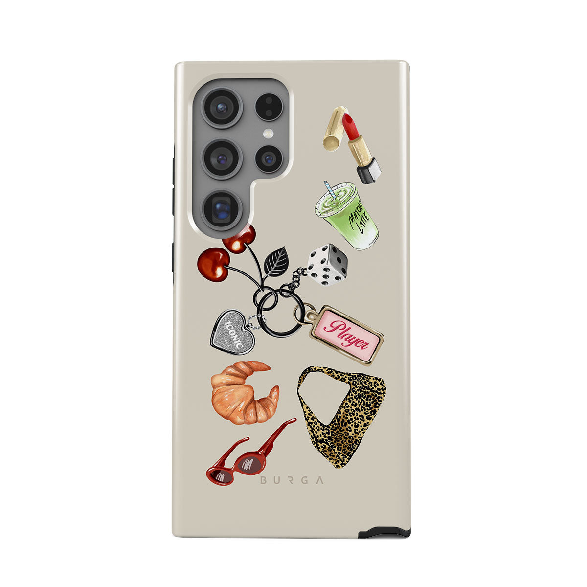 Este design contém: óculos de sol vermelhos, batom vermelho, bebida de matcha verde, croissant, dados pretos, mala com padrão leopardo, porta-chaves com coração prateado, cerejas, dados e etiqueta "Jogadora".
