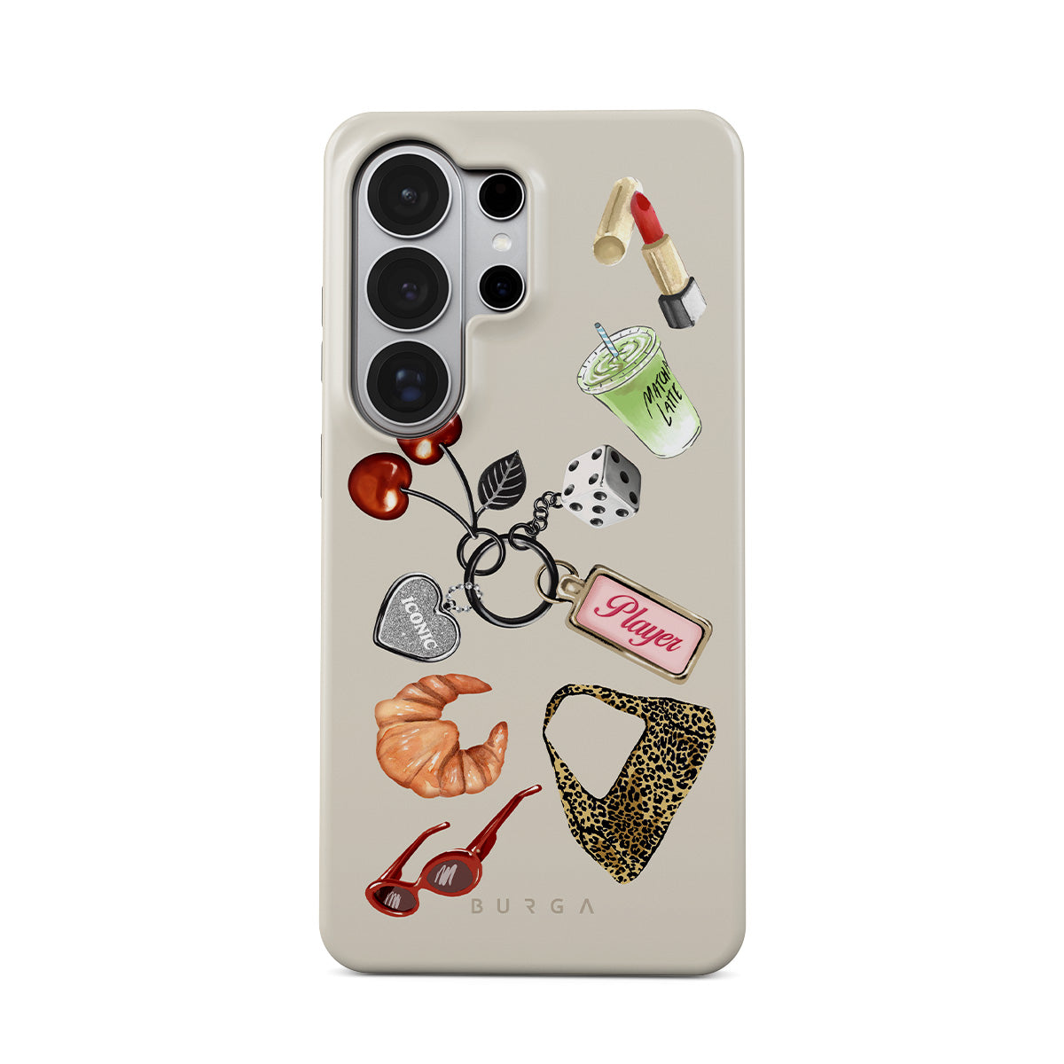 Este design contém: óculos de sol vermelhos, batom vermelho, bebida de matcha verde, croissant, dados pretos, mala com padrão leopardo, porta-chaves com coração prateado, cerejas, dados e etiqueta "Jogadora".